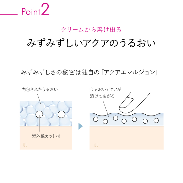 スクワラン高配合。肌にうるおいを保ち、なめらかに整えます。 化粧下地OK、ビタミンC誘導体、修復型ヒアルロン酸配合。 美容クリームのUVで、お肌やわらか。べたつかないサラサラ感触 ・ビフィズス菌培養溶解質 - 紫外線によるダメージを保護し肌の強さをサポート。 ・加水分解ヒアルロン酸アルキル(C12-13)グリセリル - 低分子ヒアルロン酸。日中の刺激に強いお肌へ ・ポリクオタニウム-51(リピジュアR) - ヒアルロン酸からさらに進化した保湿剤、肌を健やかにうるおいを保ちます。 ・(アスコルビル/トコフェリル)リン酸K - 水溶性ビタミンC誘導体・脂溶性ビタミンE誘導体の化合物 紫外線ダメージに。 ・アミノカプロン酸 - 紫外線のダメージ緩和に。 |
