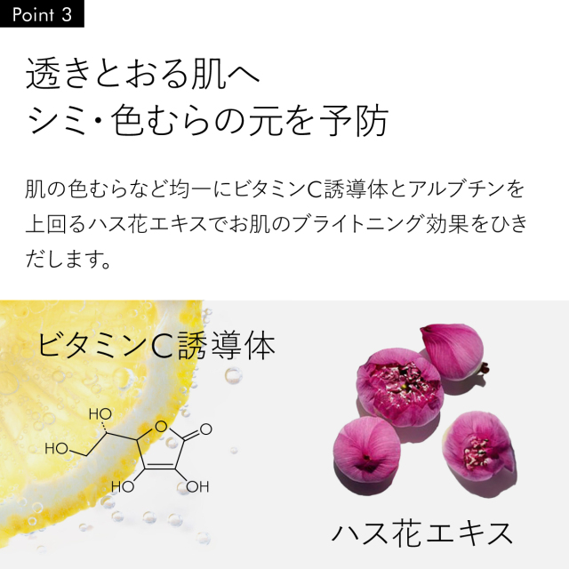 肌の色むらなど均一にビタミンC誘導体とアルブチンを上回るハス花エキスでお肌のブライトニング効果をひきだします。