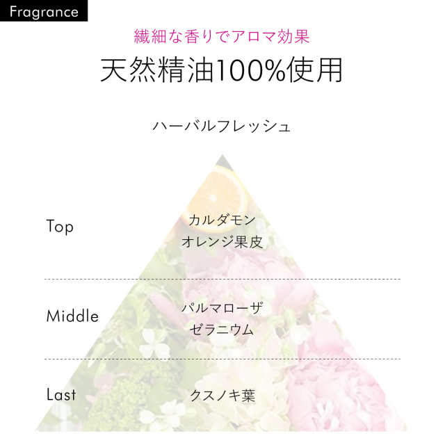 高いエモリエント効果で肌をしっかり保湿し、ハリと弾力を与え透きとおる肌に導きます。