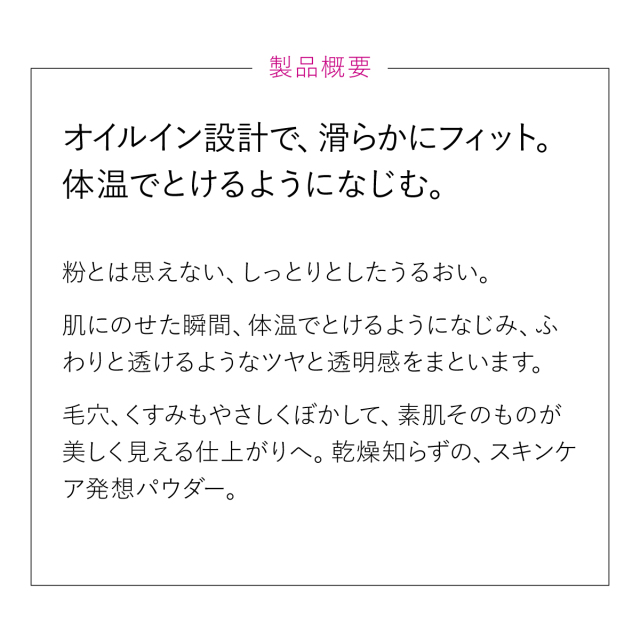 毛穴、くすみもやさしくぼかして、素肌そのものが美しく見える仕上がりへ。乾燥知らずの、スキンケア発想パウダー。