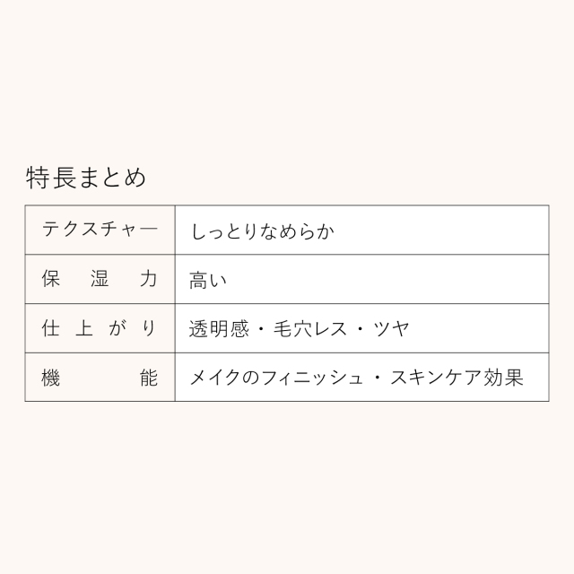 セラミド・プラセンタ・アミノ酸配合 すべりの良い感触、つけている間もしっとり、ふわふわ肌感 ソフトフォーカス効果でシワ目立ちにくく自然ななめらか感 持ち運び便利なサイズ(幅:6.3cm・高さ:2.5cm) |