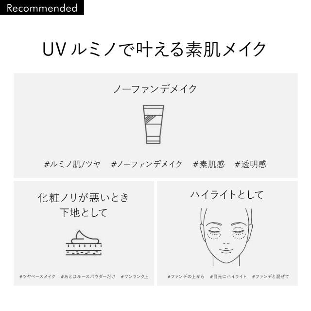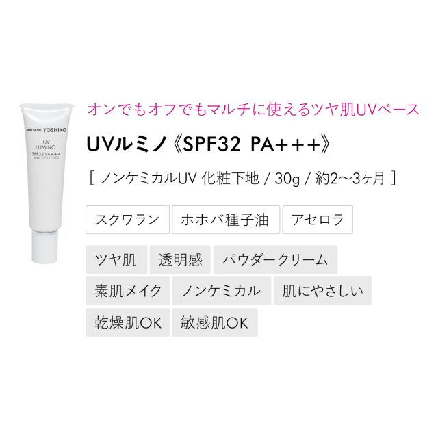 保湿力が高いUVルミノは肌にやさしいノンケミカル、シリコンフリー。乾燥して化粧ノリが悪いと感じたら下地にルミノを。
