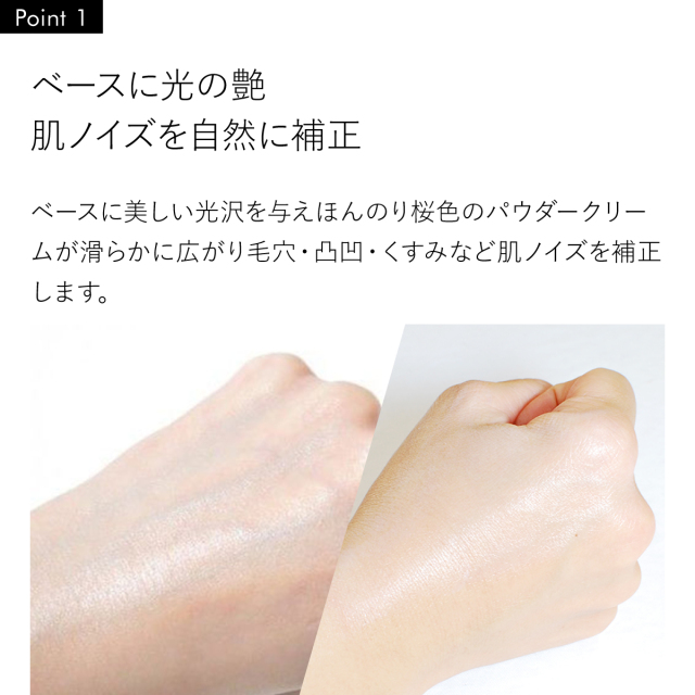 ベースに美しい光沢を与えほんのり桜色のパウダークリームが滑らかに広がり毛穴・凸凹・くすみなど肌ノイズを補正します。。